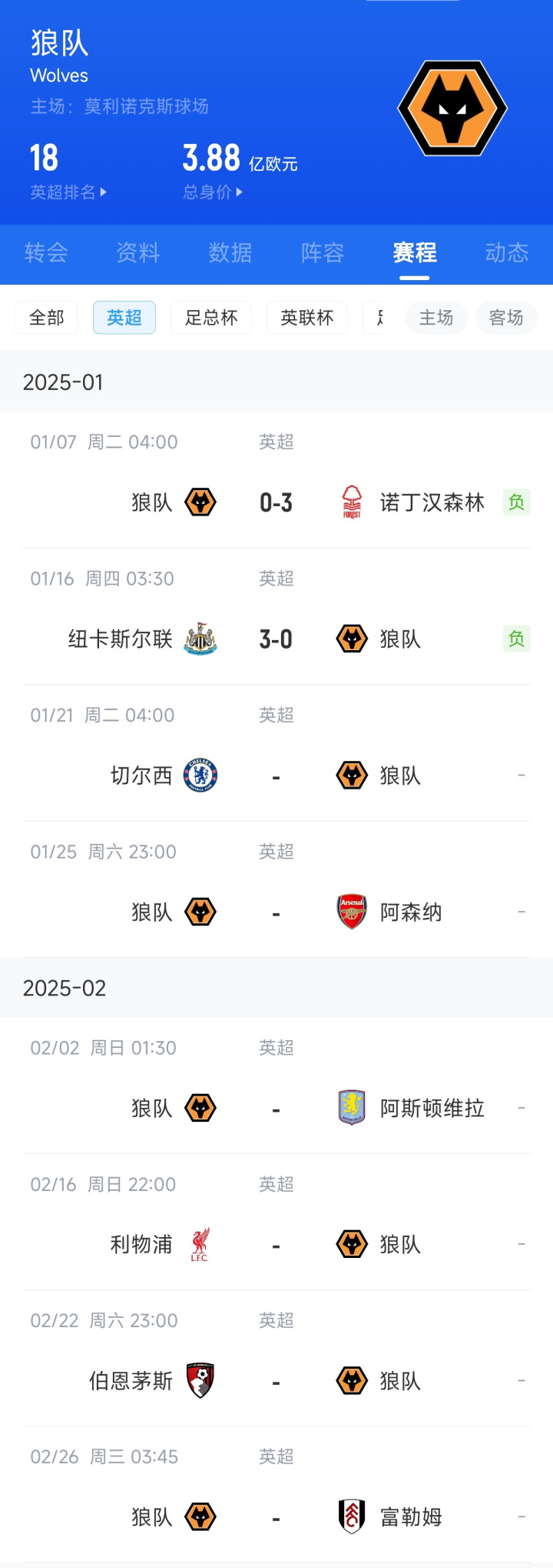 狼队现在也曾是麇集两个0-3惨败给英超前四的球队:0-3诺丁汉丛林(第3)、0-3纽卡斯尔(第4)。