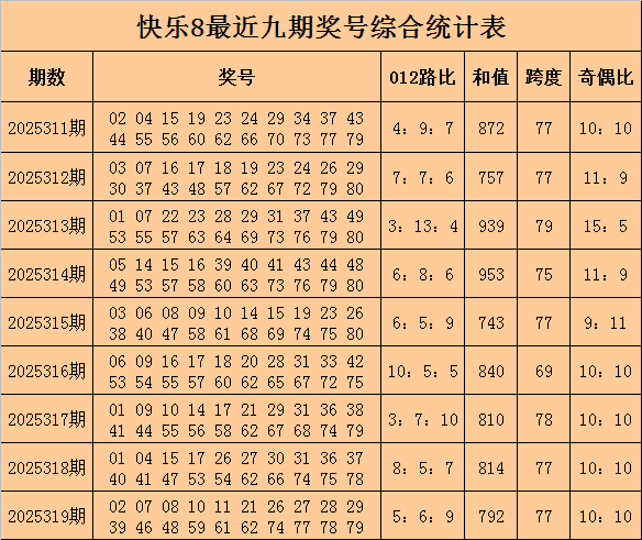 福彩欢快8第2025319期开奖总结奖号:02 07 08 10 11 21 26 27 28 29 39 46 48 59 61 62 74 77 78 79体育集锦,其中奖号奇偶比为10:10,012路比为5:6:9,和值为792,跨度为77。