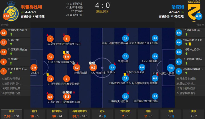 利雅得告成4-0哈森姆,C罗首发踢满全场,赛后梅开二度的他得回9.3分,为全场第二高分,2传1射的科曼得回9.2分,为全场第三高分。全场最高分是输球球队的门将,得回了满分10分。利雅得告周详场共有12次射正体育集锦,其中C罗7次射门5次射正。