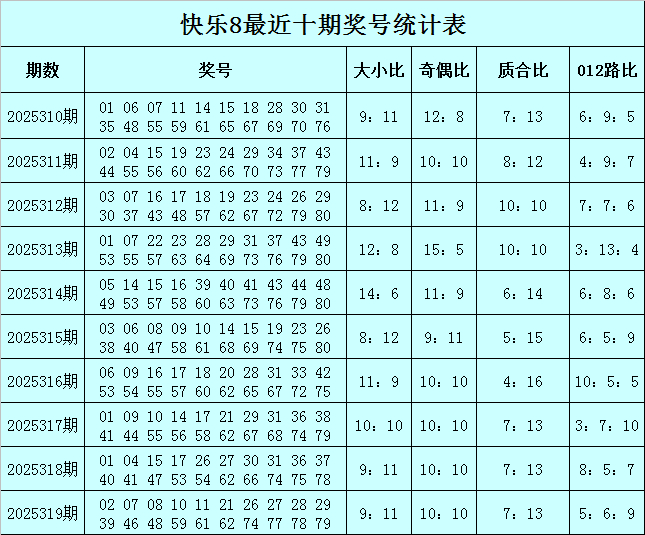 福彩悠然8第2025319期开奖回顾:02 07 08 10 11 21 26 27 28 29 39 46 48 59 61 62 74 77 78 79,其中奖号大小比开出9:11,奇偶比开出10:10,质合比开出7:13,012路比开出5:6:9。
