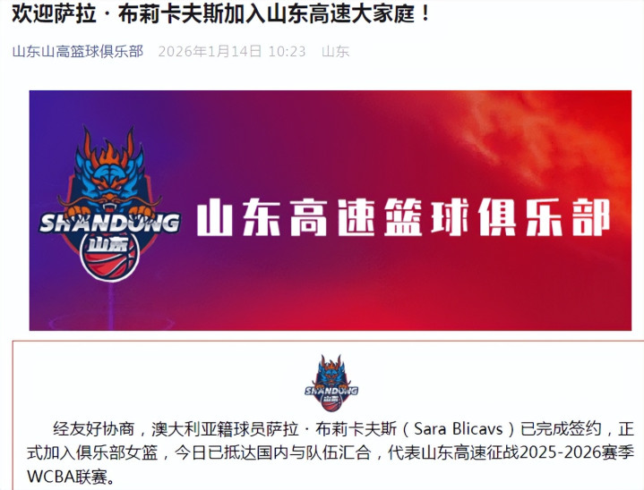 北京时间1月14日,山东女篮在引进超等新星张子宇后,如今官宣签约WNBL两届冠军萨拉-布莉卡夫斯,且此前她们刚刚斥逐卫冕冠军广东女篮的开局14连胜,山东女篮持续升级声势当然是剑指冲冠。