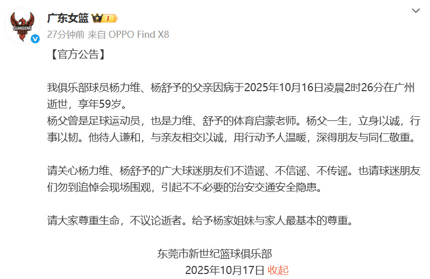 我俱乐部球员杨力维、杨舒予的父亲因病于2025年10月16日凌晨2时26分在广州解除,享年59岁。